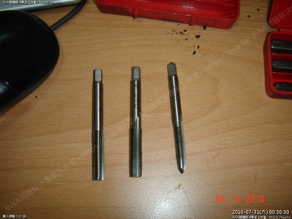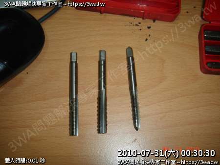 最右邊為一般五金行買到的牙攻,中間跟左邊則是「特殊牙攻」同樣為M6,但特殊牙攻是專門攻給「彈簧牙套」用的,所以size較大,中間跟左邊那支在尖端部有些許不同,中間那支前面較尖,可以讓你省去還要使用電鑽的步驟,就可以直接用原來滑牙的孔,來擴大到可以放牙套的大小。 【第4張】 |